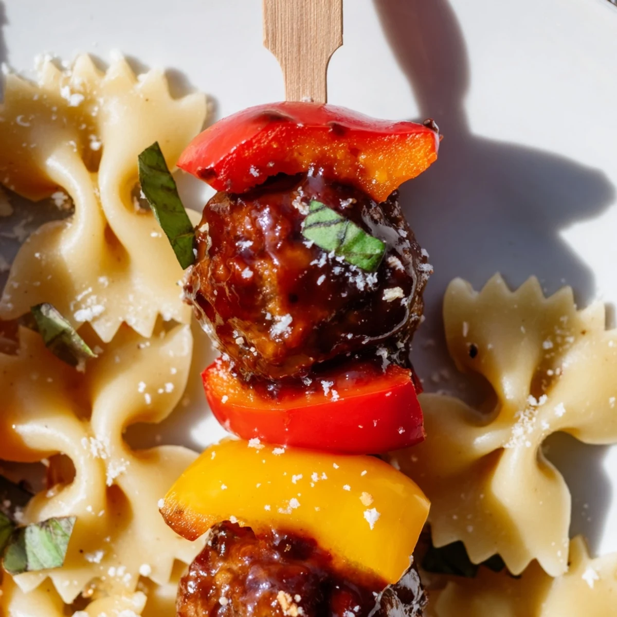 These playful skewers bring together tender bowtie pasta and juicy cocktail meatballs with vibrant bell peppers and grape tomatoes. Coated in a sweet and savory glaze of barbecue sauce and honey, they create a perfect balance of flavors that will delight guests at any gathering.