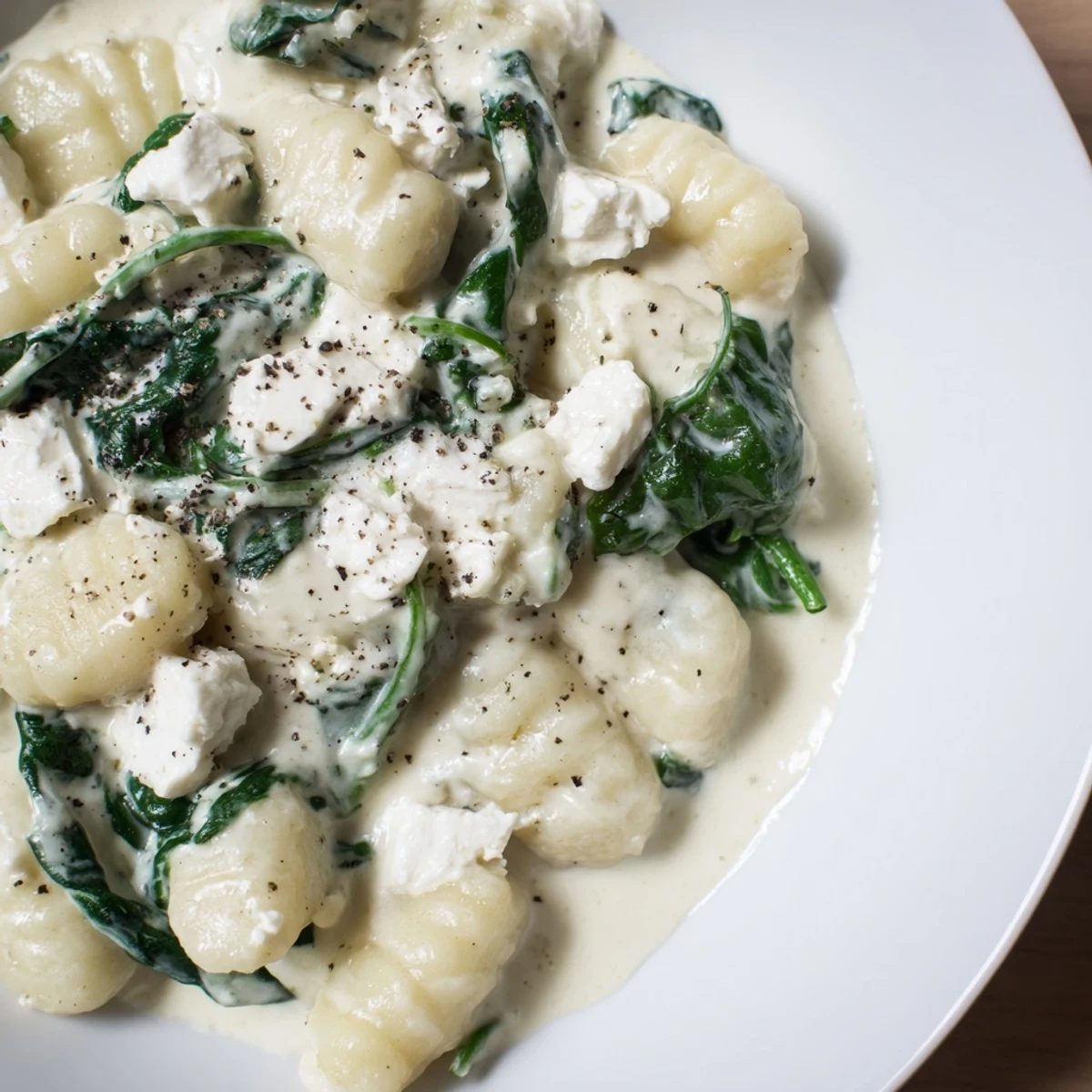 The sauce comes together by sautéing onion and garlic, wilting spinach, then creating a rich base with heavy cream and melted cheeses. The gnocchi cooks in just 2-3 minutes until they float, then gets tossed directly into the sauce to absorb all the flavors. A pinch of nutmeg adds subtle warmth, while extra feta on top provides a salty finish.
