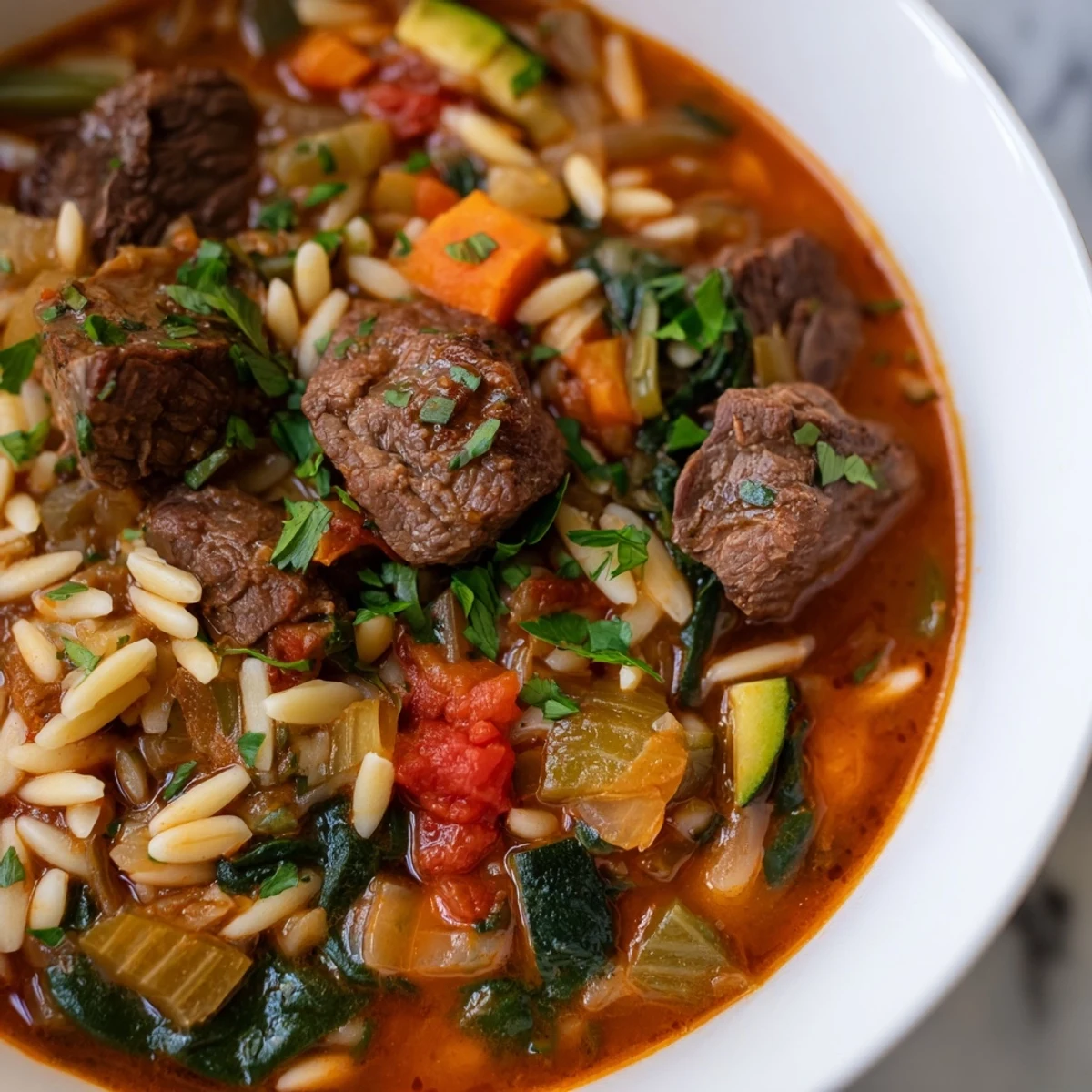 This satisfying soup combines tender chunks of beef stew meat with small orzo pasta and a colorful medley of garden vegetables. The broth develops deep flavor as it simmers with aromatic onions, garlic, carrots, celery, bell peppers, zucchini, and green beans. Diced tomatoes and tomato paste add richness while dried thyme and oregano provide classic herbs. Fresh spinach wilts in at the end for vibrant color and nutrients. The result is a filling, nourishing meal that tastes even better the next day.