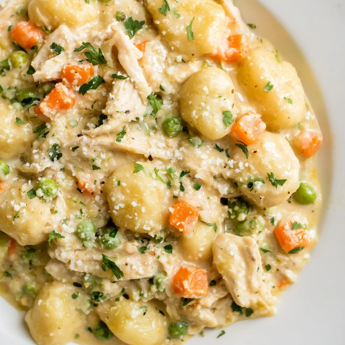 - Fold in the uncooked gnocchi, shredded chicken, and frozen peas, stirring gently to combine everything. Make sure the gnocchi are mostly submerged in the sauce so they cook evenly and absorb all that flavor.