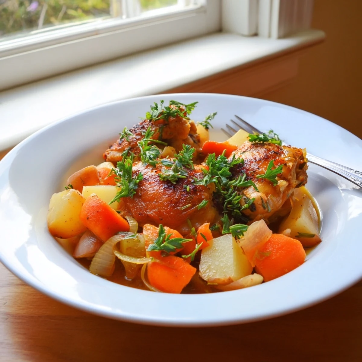This comforting slow cooker meal features tender chicken thighs nestled alongside hearty vegetables like carrots, potatoes, and celery. The chicken simmers for six hours in a savory broth infused with dried thyme, rosemary, and paprika, resulting in incredibly tender meat and flavorful vegetables. With just 15 minutes of prep time, this hands-off dinner becomes a complete meal with minimal effort.
