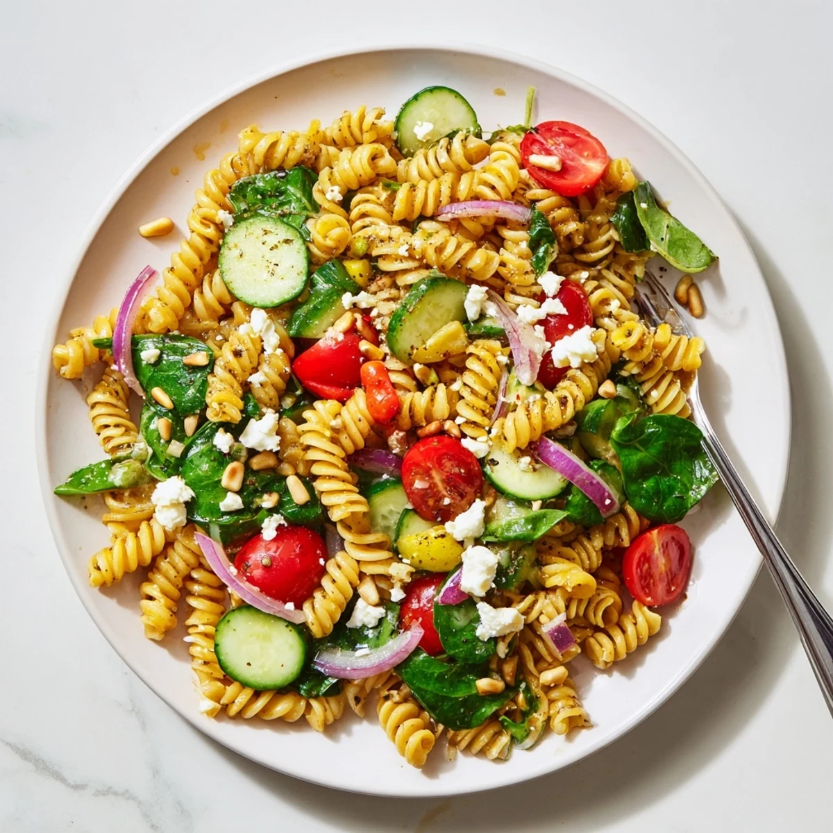 This refreshing summer dish combines al dente pasta with crisp cherry tomatoes, cucumber, bell pepper, and red onion. The baby mixed greens add tender texture while the homemade lemon-herb dressing brings bright, zesty flavor. Ready in just 30 minutes, this versatile salad serves four and works beautifully for picnics, barbecues, or light lunches.
